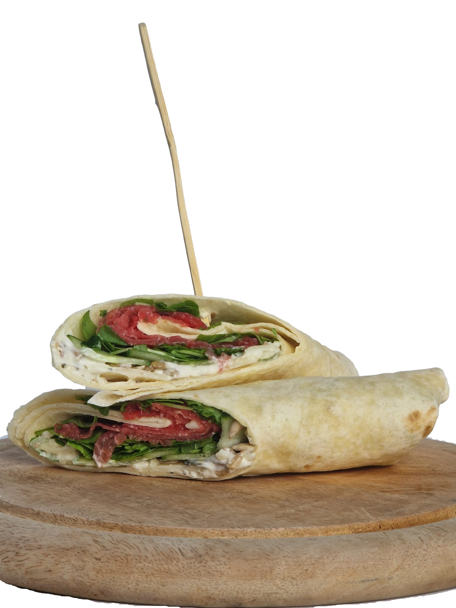 Tortilla wrap belegd met: komkommer, kaassnippers, pijnboompitten, rucola en uiteraard met een overheerlijke truffelmayonaise.